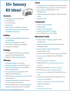 Finally, create a sensory kit. A sensory kit can include any number of things that you know will combat overload and anxiety and keep it with you when you are out. Knowing that you have things close to you that will help you relax will sometimes be enough to divert your brain away from panic and anxiety (Neff, 2024).